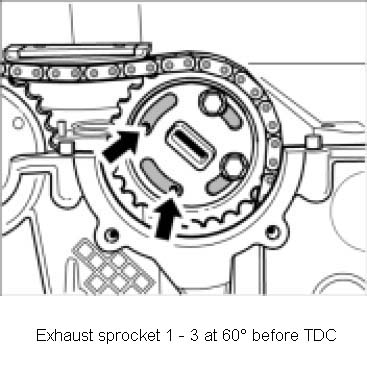 28. Insert exhaust camshaft sprocket in the timing chain and position on camshaft flange. The four threaded bores in the camshaft flange must be fully visible on the left at the slotted curves of the sprocket-arrows- so that the M6 x 12 Torx screws can still be positioned to fasten the sprocket.
