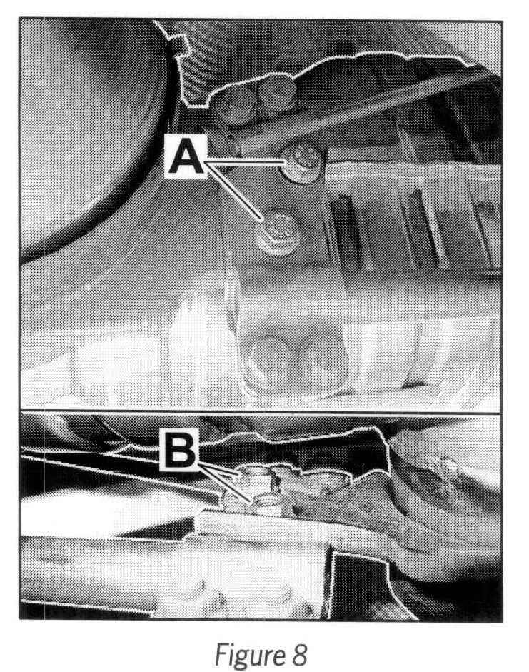 2.6 Secure the two rear mufflers on the rear muffler holder with four new M8 x 16 hexagon-head bolts (--> Figure 8-A-) and four new M8 hexagon nuts (--> Figure 8-B-).
