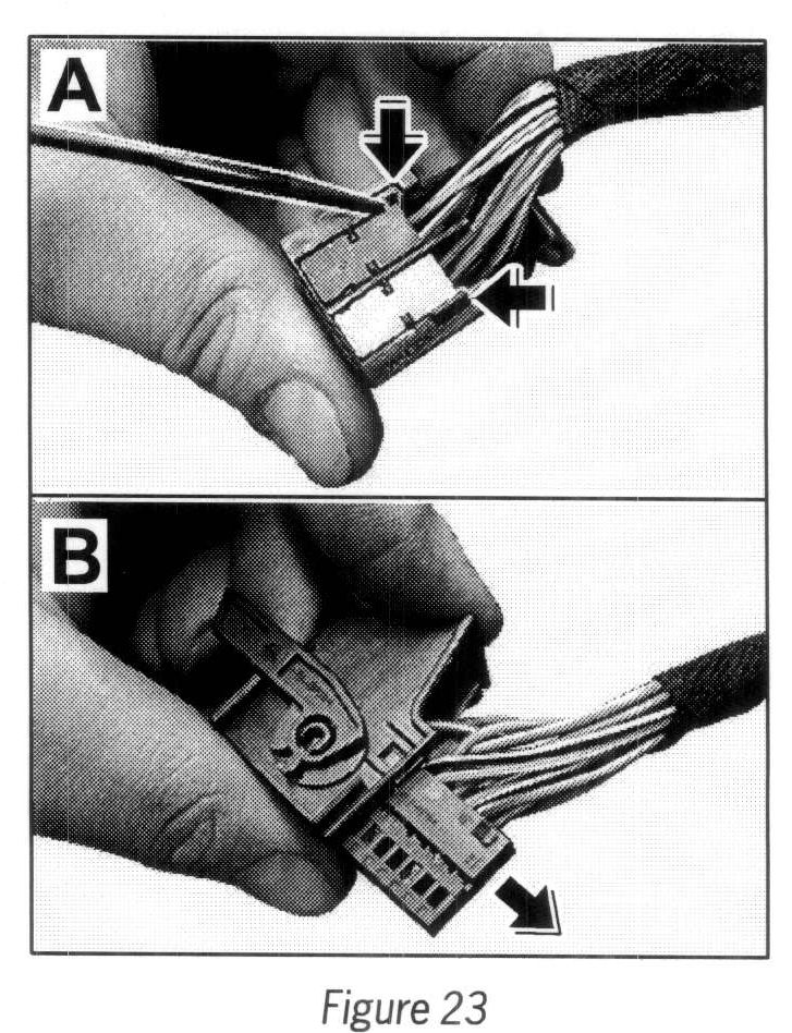 6.2.2 Release secondary lock on connector housing D --> Figure 23-A, arrows - and pull both connectors out of the housing --> Figure 23-B, arrow-.