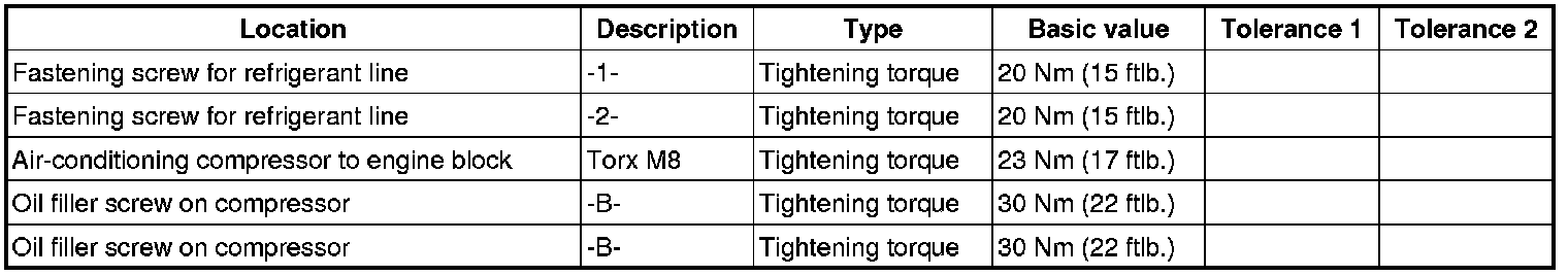 9. Screw in rear Torx screw for air-conditioning compressor (M8 x 120) -1- and tighten all three screws for air-conditioning compressor. => Tightening torque: 23 Nm (17 ftlb.).