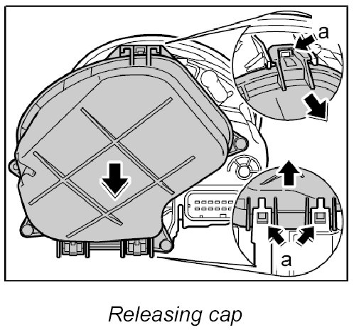 2. Release cap once at the top and twice at the bottom -a- and remove from the main headlight.
