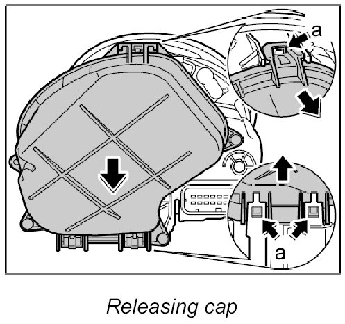 2. Release cap once at the top and twice at the bottom -a- and remove from the main headlight.