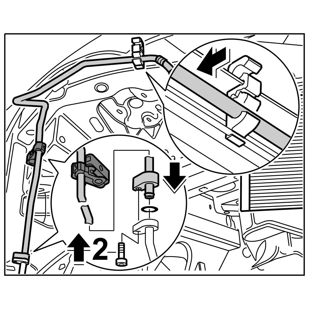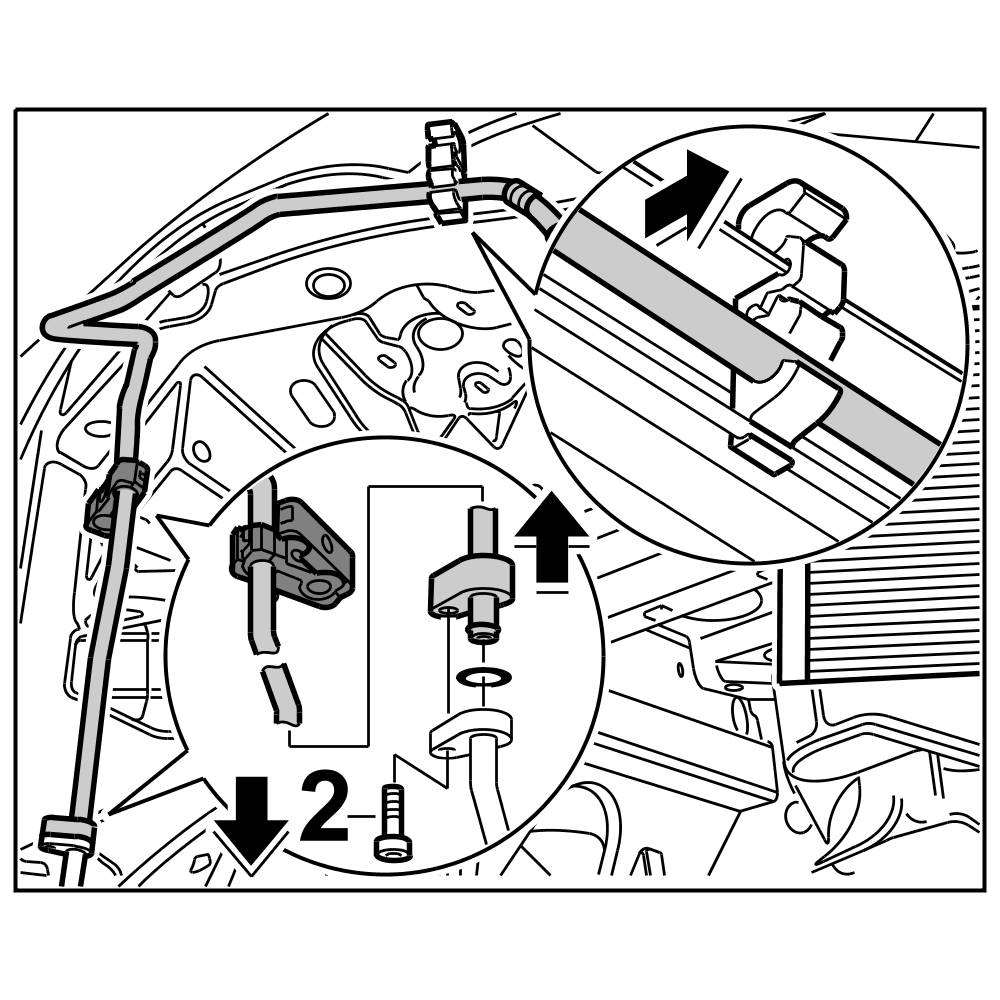 2. Insert compressor-condenser line into the line to the compressor and fasten with the fastening screw -2-. => Tightening torque: 14 Nm (10.5 ftlb.)