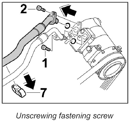 1. Unscrew fastening screw -1- on compressor, pull out line on compressor and remove it from support -7-.