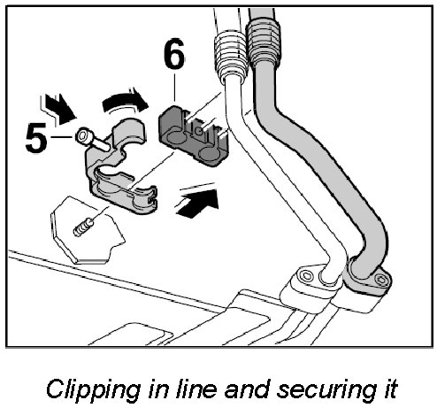 4. Insert line in underbody area into rubber mount -6-, close support and secure with fastening nut -5-.