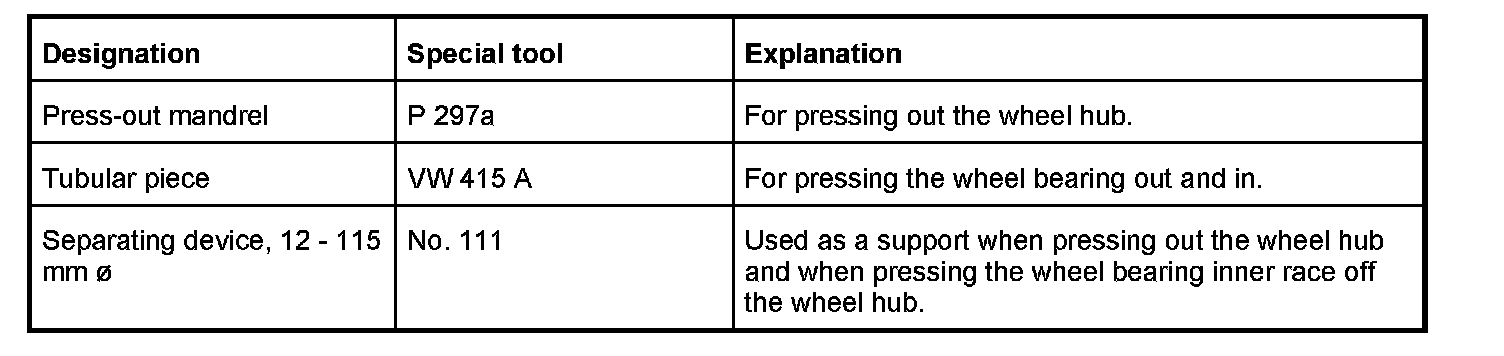 Press the wheel hub out using a press-out mandrel P 297a. A separating device ([diameter] = 12 - 115 mm) NR.111 and a suitable support must be used for countering.