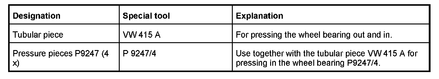 Insert wheel bearing at the correct position, then press again on the wheel bearing housing with only slight force using a suitable pressure piece (9247/4), see pressure piece (4 x) P 9247 and tubular piece VW 415 A.