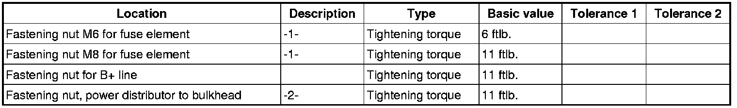 1. Position the fuse elements -3- in the power distributor in accordance with the wiring diagram and position the marked connection leads in turn, fit the washer -2- and tighten with the fastening nuts -1-. => Tightening torque: 6 ftlb. => Tightening torque: 11 ftlb.