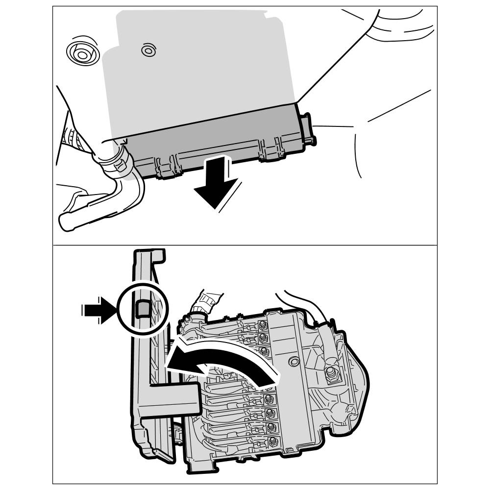 8. Push the B+ of the battery onto the mounting point as far as the stop. Check that the B+ line sits firmly.