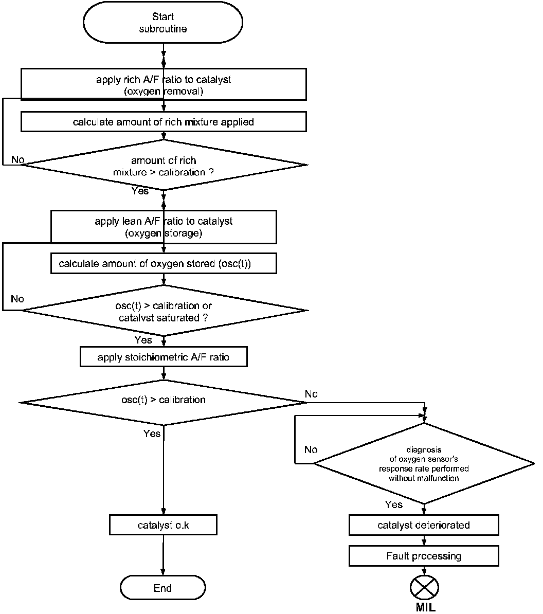 The main catalyst check is based on the direct measurement of the catalyst's OSC during the transition from a rich to a lean air-fuel mixture. The required set up is depicted in figure 1. The air-fuel ratio can be precisely determined with the upstream wide band oxygen sensor. The downstream oxygen sensor delivers information about the OSC of the catalyst.