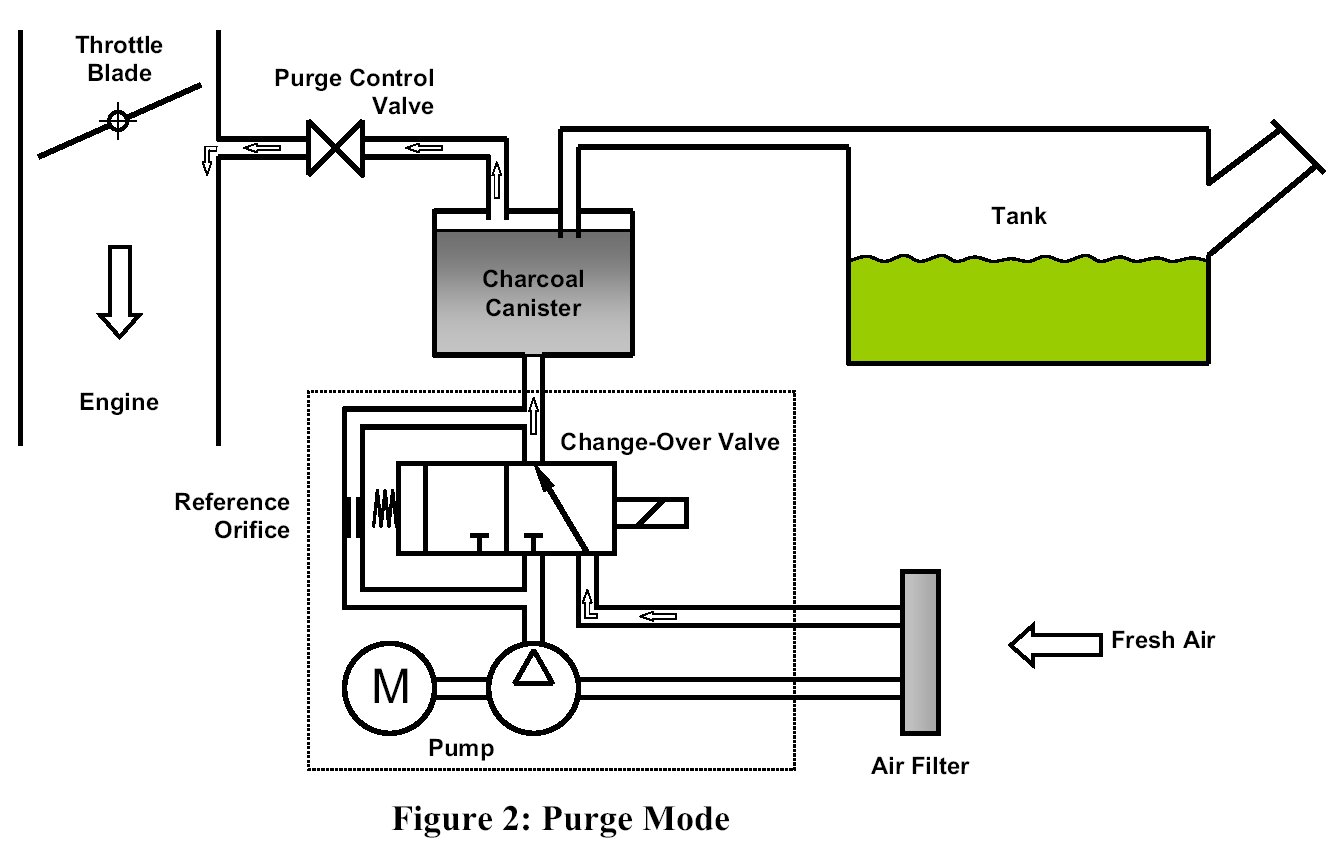 The DM-TL (Diagnostic Module Tank Leakage) is used for monitoring the evaporative system for small (> 0.02 in) and rough (> 0.04 in) leaks. It consists of an electrically driven air pump, a change-over valve and a 0.02 inch orifice for reference measurement - see Fig. 1. The tightness of the tank system is obtained by comparing the actual air pump's motor current with that measured when the system is operated with a standardized reference orifice.