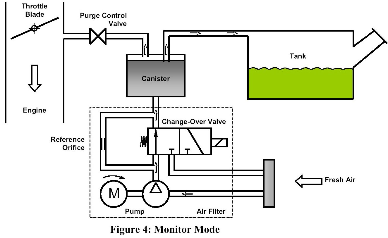 In the Monitoring Mode (Fig. 4) the change-over valve is switched on while the purge control valve remains closed. The motor current drops to a zero-load level. Fresh air is now pumped through the charcoal canister into the tank. A small overpressure, indicated by an increase in the motor current, builds up if the evaporative system is tight.