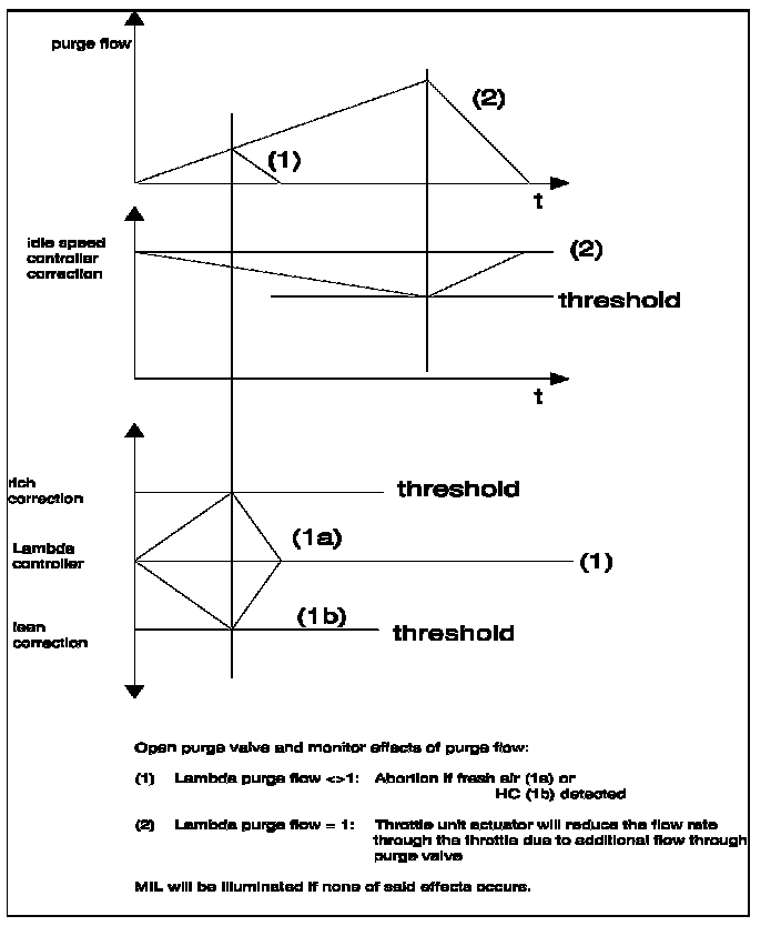 In this case, the Lambda controller does not need to compensate for a deviation. However, when the EVAP Purge Valve is completely opened, the cylinder charge increases significantly. Therefore, flow through the throttle unit must be decreased in order to maintain the desired idle speed. Flow through the EVAP Purge Valve is assumed when the flow through the throttle unit is reduced by idle control. The EVAP Purge Valve is reset and the diagnosis is completed.