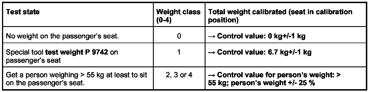 10.1.2. Place the special tool test weight P 9742 on the passenger's seat. The Passenger Airbag Off indicator light in the centre console must come on. Compare values (see table below) using the PIWIS Tester.