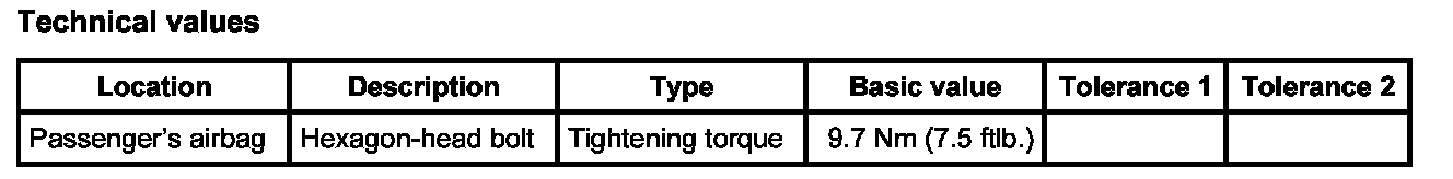 4. Secure the airbag module and reinforcement plate with the four new fastening screws -2-. Tightening torque: 9.7 Nm (7.5 ftlb.)