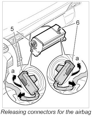 3. Carefully prise out the locking unit -5- and -6- the electric connectors to the left and right with a screwdriver -a- and then pull the connectors out of the airbag unit.