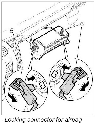 1. Lift airbag unit underneath the dashboard and insert and lock connectors -5- and -6-.