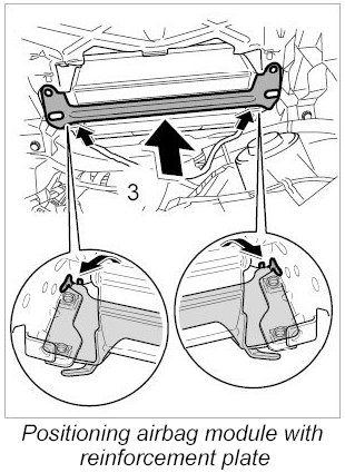 3. Position the airbag module with the reinforcement plate onto the mounting bracket from below.