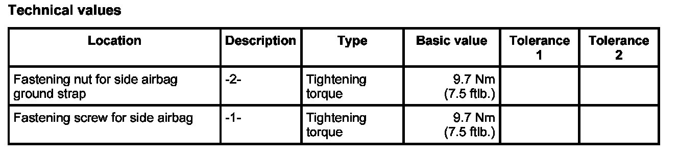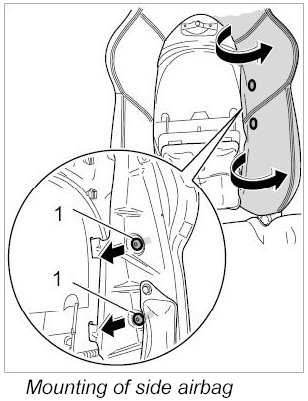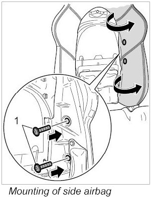 1. Lift up the appropriate detached side bolster and undo the two fastening screws -1- from the airbag unit.