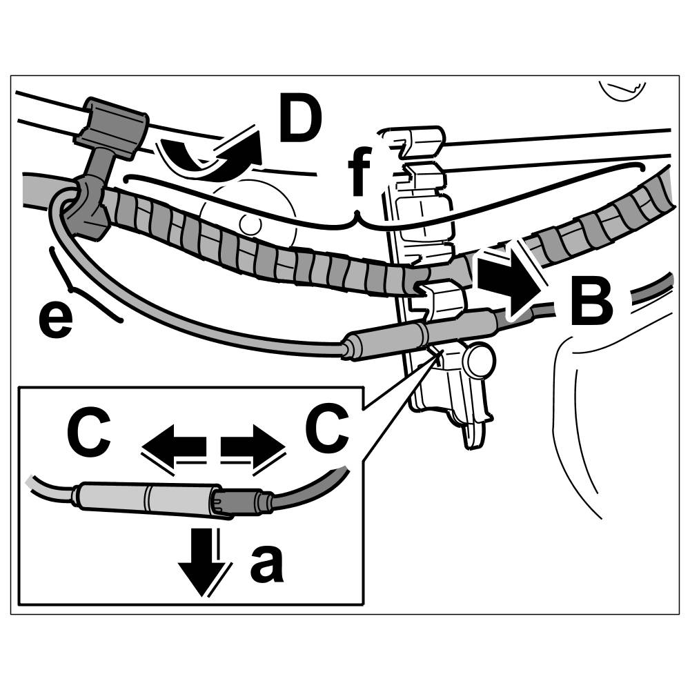 4. Secure a new cable holder on the main wire harness, position it at the actuating cable and close it -Arrow C-.