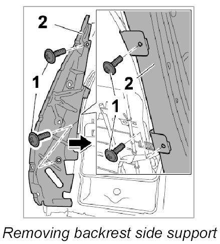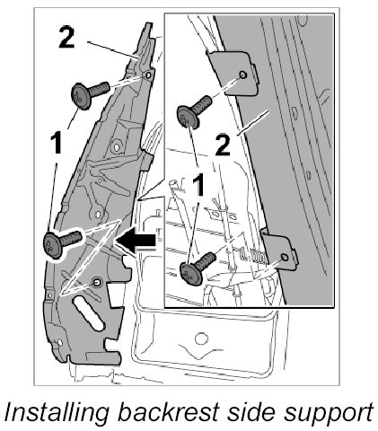 1. Unscrew the four fastening screws -1- and remove backrest side support -2-.