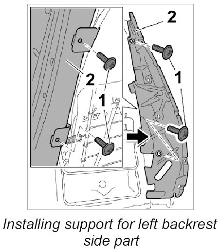 1. Unscrew the four fastening screws -1- and remove support for backrest side part -2-.