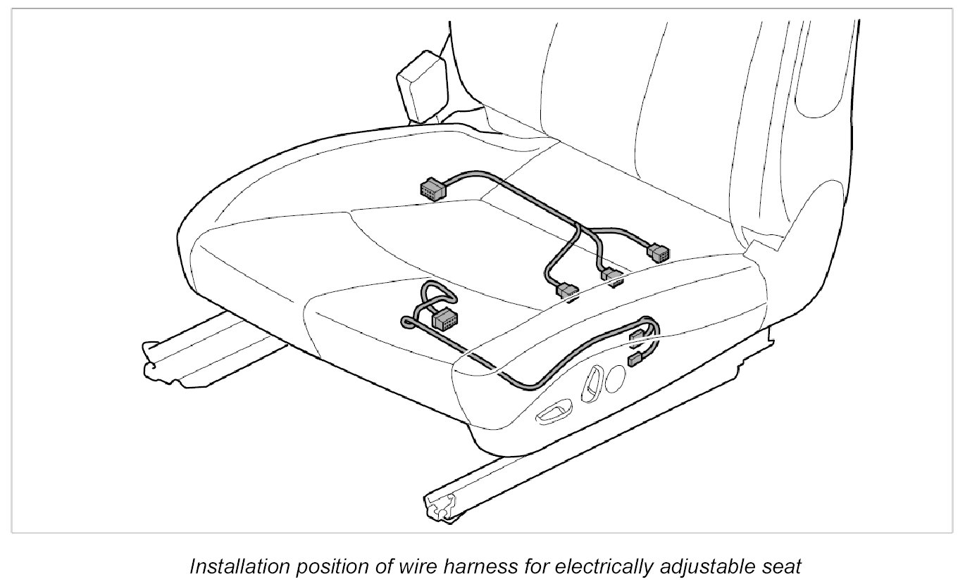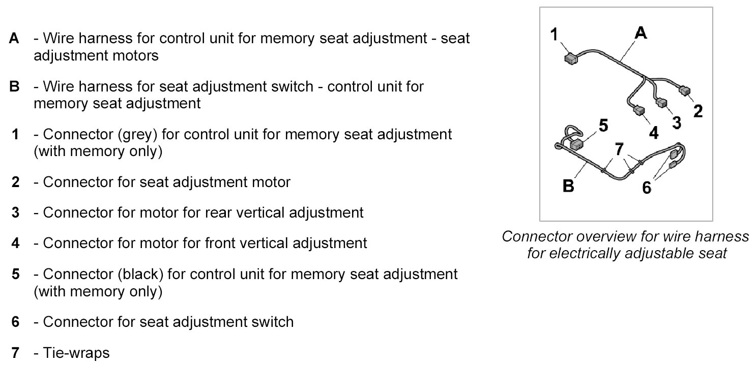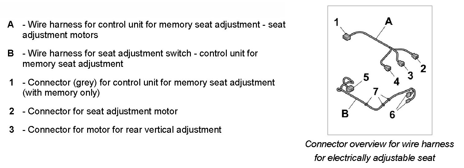 INFORMATION: This description covers the two-piece wire harness for an electrically adjustable seat with memory. Some plug connections will not be present on a single-piece wire harness without memory.
