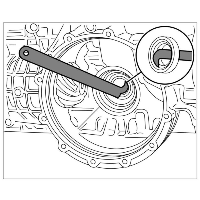 Hook VW 681 must be fitted behind both sealing lips of the sealing ring because fitting it on the outer circumference of the sealing ring can damage the contact surface in the transmission housing. Guide the tool carefully while pulling out.