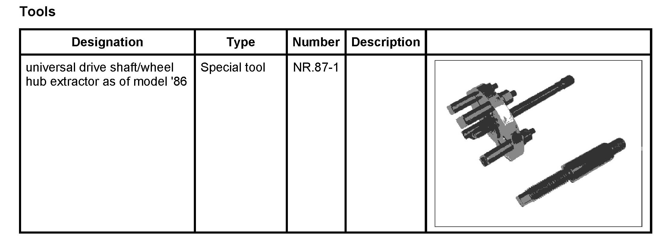 2. Use universal drive shaft/wheel hub extractor as of model '86 NR.87-1 to carefully press out the pin of the drive shaft until the shaft can be moved by hand.