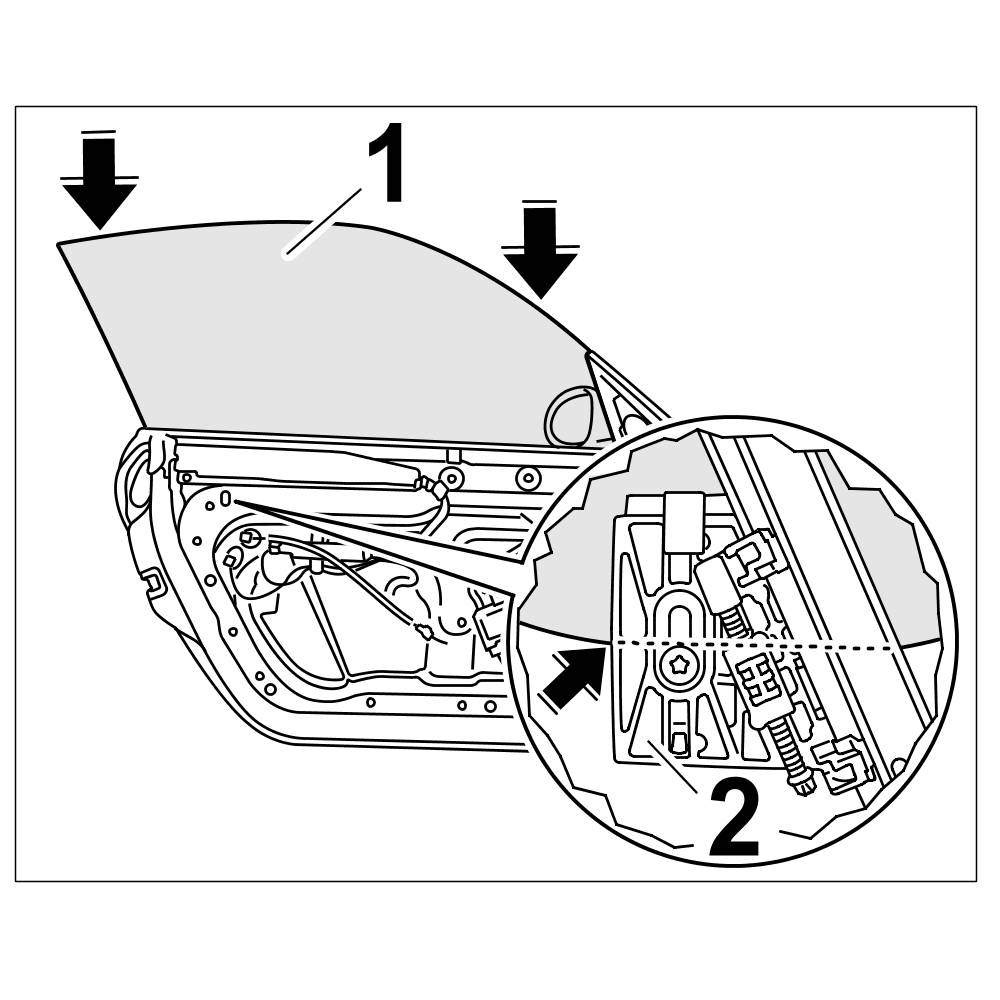 1. Insert front door window -1- into the door channel -Arrows- and position in the clamping jaws -2-.