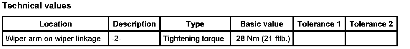 1. Position wiper arm on the wiper linkage, align it and secure in place with the fastening nuts -2-. - Tightening torque: 28 Nm (21 ft. lbs.)