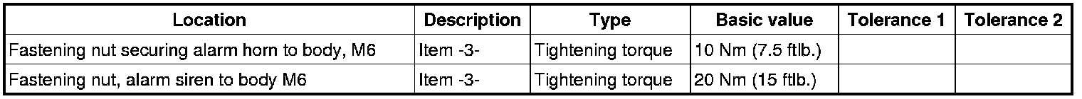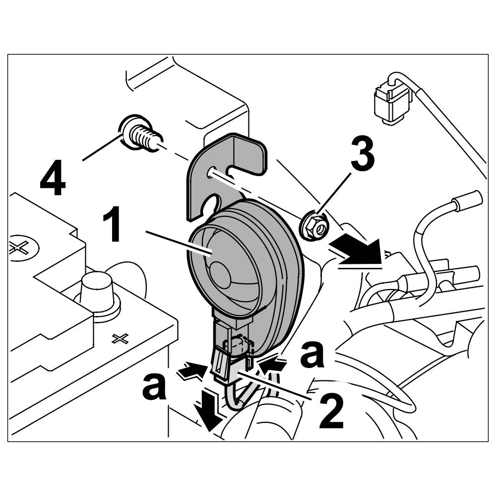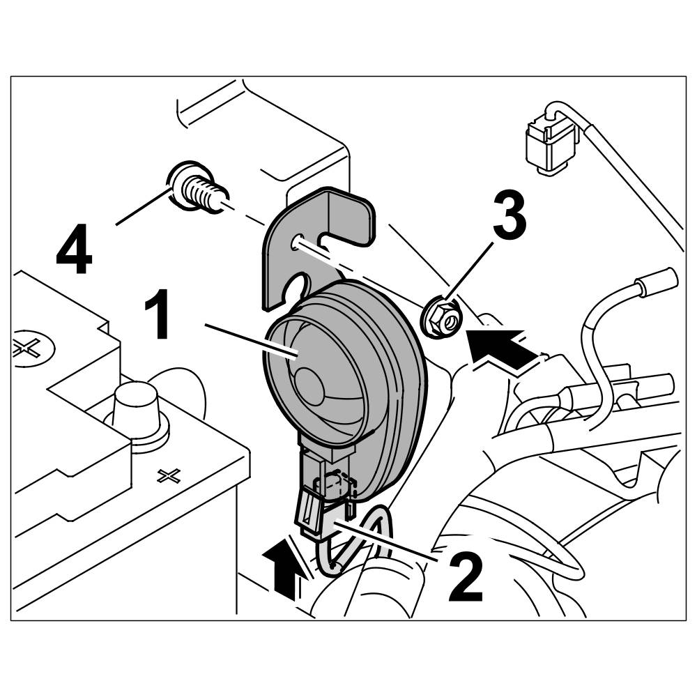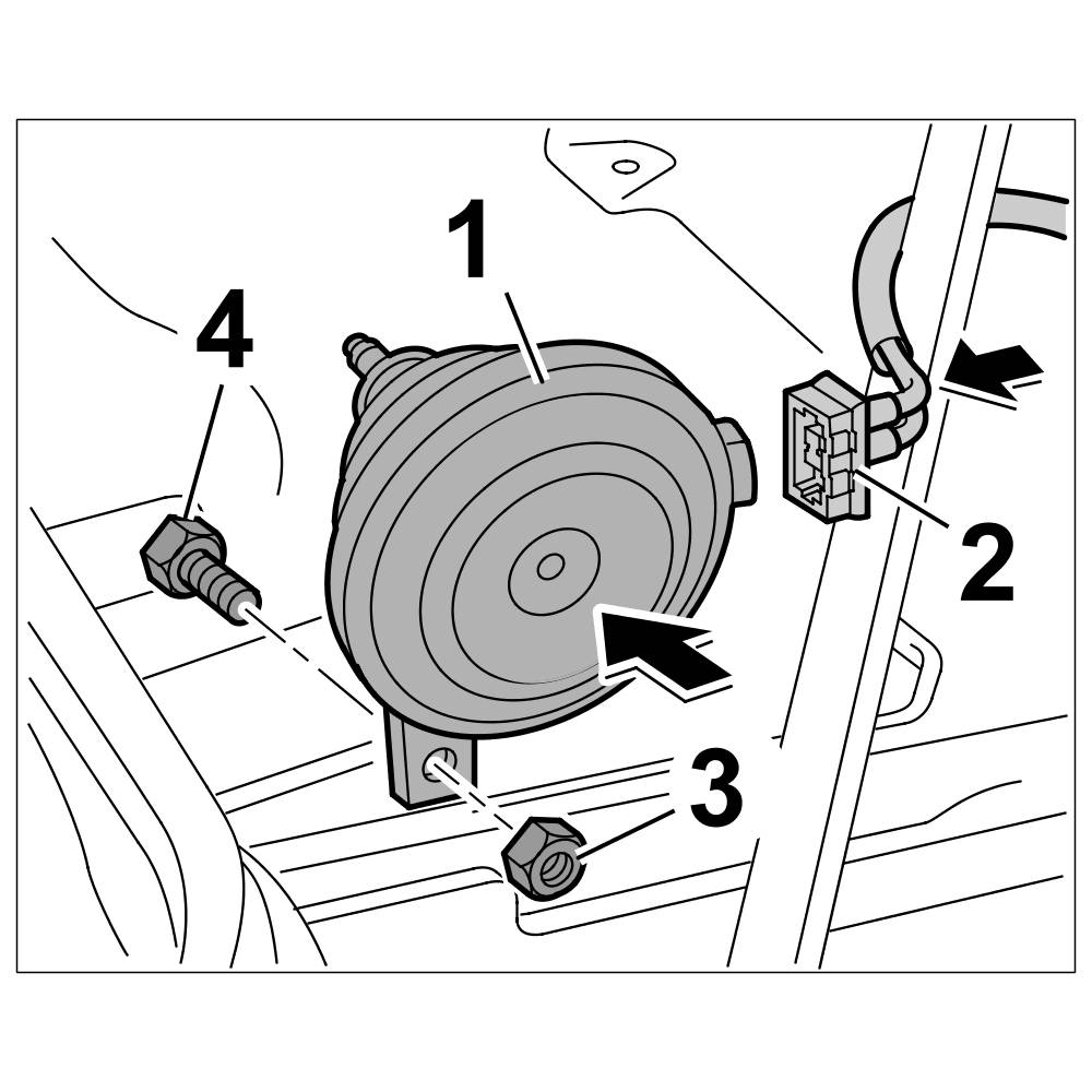 1. Position alarm horn -1-. Insert fastening screw -4- , counter (if necessary) and tighten the fastening nut -3-. => Tightening torque: 10 Nm (7.5 ftlb.)