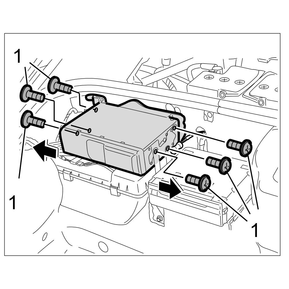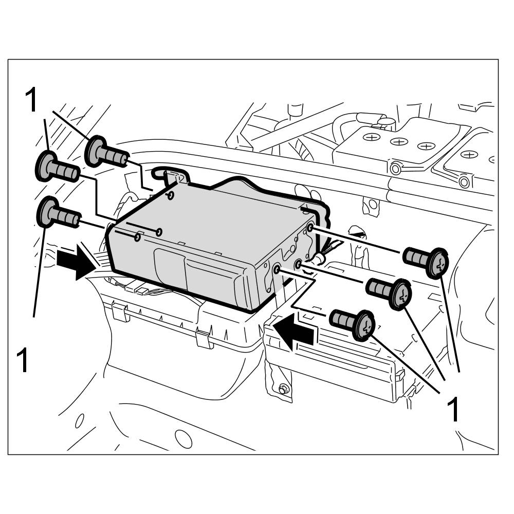 4. Insert the CD changer into its retaining frame and screw down tight with six fastening screws -1-. => Tightening torque: 2.5 Nm (2.0 ftlb.)