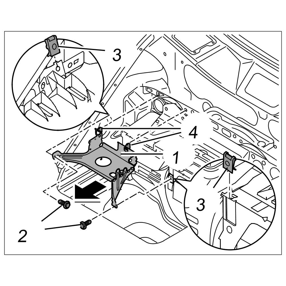 2. Press in holder for CD changer -1- with both fastening parts -4- to the body and tighten both fastening screws. => Tightening torque: 6.5 Nm (5 ftlb.)