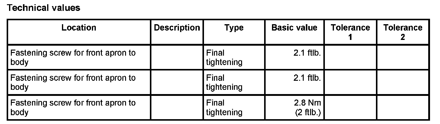 1. Screw in fastening screws -1- at the bottom on the front apron -2- and tighten to the specified torque. Final tightening: 2.8 Nm (2 ftlb.)