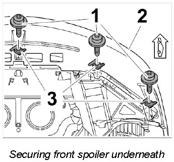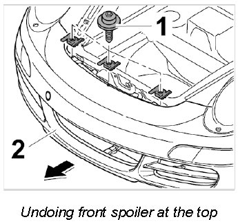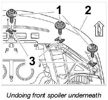 1. Unscrew fastening screws -1- underneath the front spoiler -2-.