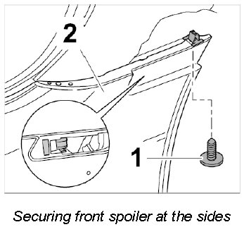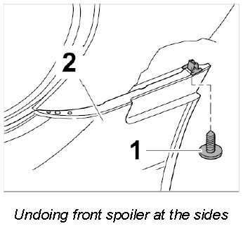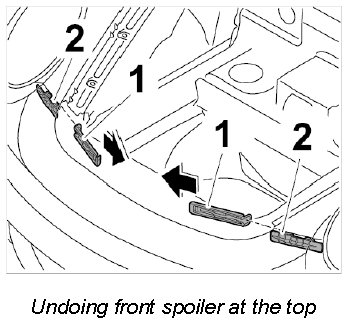 1. Unscrew fastening screws -1- at the sides of the front spoiler -2-.
