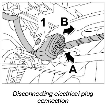 1. Disconnect wiring harness -1-. Press lug -arrow A- and pull plug connection apart -arrow B-.