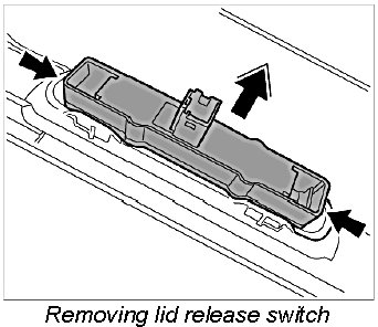 1. Press fastening ribs of scuff plate -arrows- outward with a small screwdriver and unclip switch for lid release.