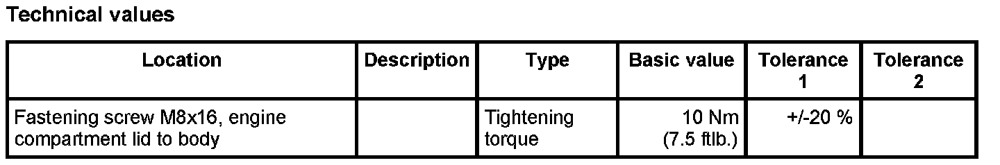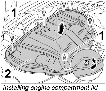 1. Position engine compartment lid -2- and tighten with fastening screws -1-. Tightening torque: 10 Nm (7.5 ftlb.) ±20 %