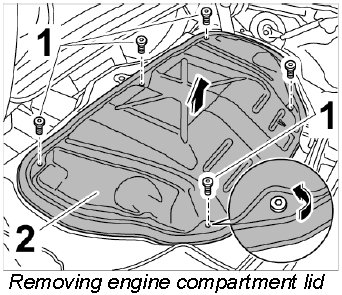 1. Unscrew fastening screws -1- and remove engine compartment lid -2- upwards.