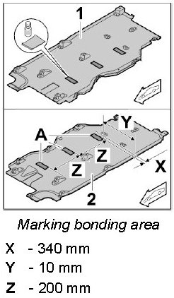 2. Mark the bonding area for the foam strips -A- on the inside of the centre underbody cover -1, 2- (left/right).