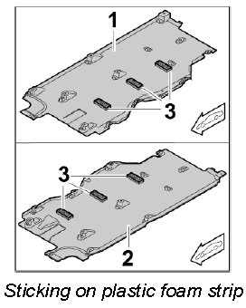 4. Stick on the foam strips -3- in the marked areas of the centre underbody cover -1, 2- (left/right).