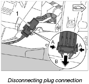 1. Release wire harness electric plug connection for centre console -1- on right and left -Arrows A- and pull apart -Arrow B-.