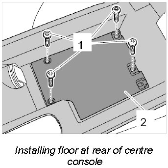 4. Insert floor at rear of centre console -2- and screw down with fastening screw -1-.