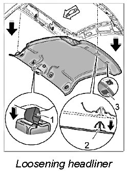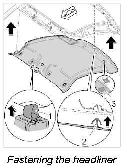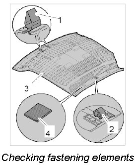 8. Check clamps -1- and fixing clip -2- of headliner -3- for deformation, replace if necessary.