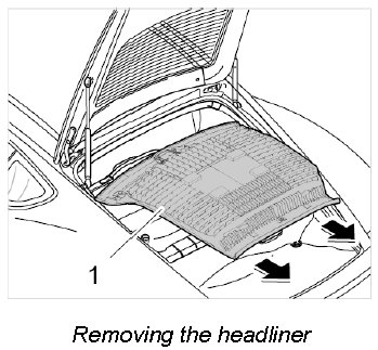 7. Carefully take out headliner -1- toward the rear through the tailgate opening.