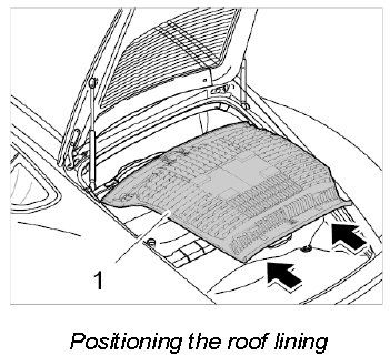1. Guide headliner -1- into the vehicle through tailgate opening and position at roof frame.