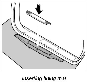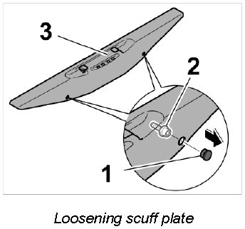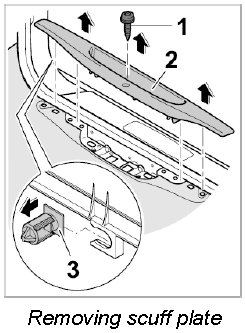 1. Take off plastic caps -1- and loosen the fastening screws -2- of the scuff plate -3-.