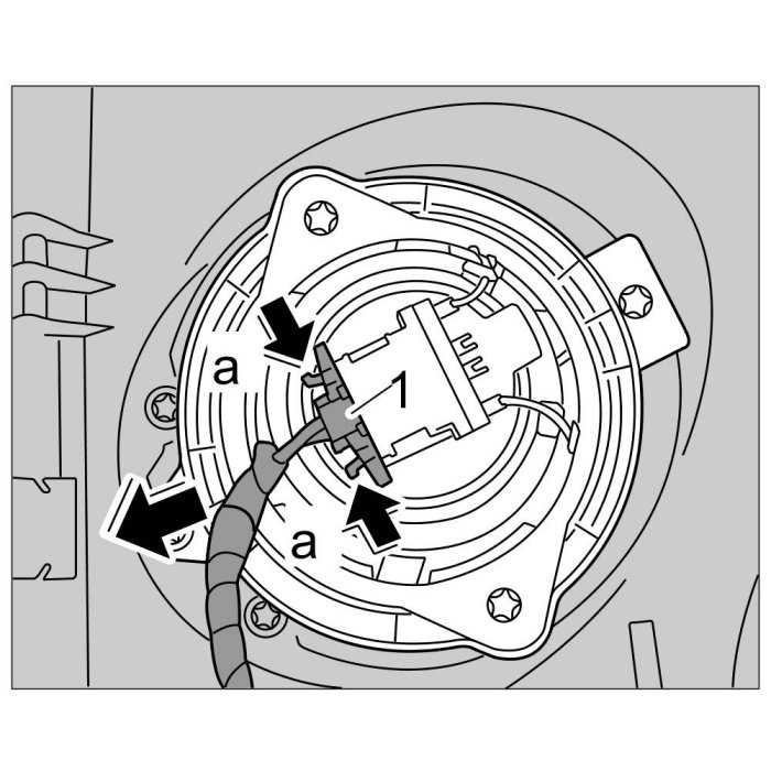 3. Press locking tabs together -Arrows a- and disconnect connector for loudspeaker -1-.